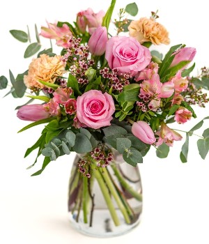 Show them how much you appreciate them this Mother's Day with Devotion. Featuring pink tulips, pink roses, pink alstroemeria, and beautiful seasonal foliage. Send unforgettable moments at a price you will forget. Please note that substitutions of some flowers may be necessary to ensure timely delivery, these will match the colour scheme and be of the same value.