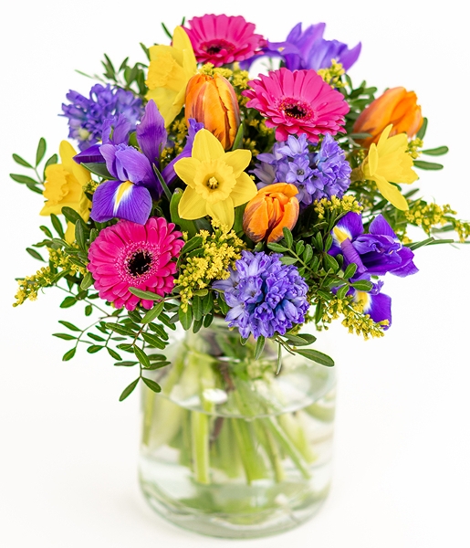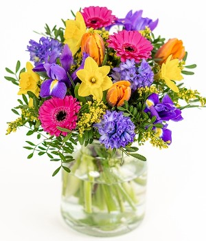 This bold and beautiful spring bouquet is lovingly hand-prepared and delivered by a local florist to your lucky recipient. Featuring delightful daffodils, hyacinths, cerise germini, iris, tulips, and seasonal foliage. Enjoy great value flowers without sacrificing quality with Eflorist.